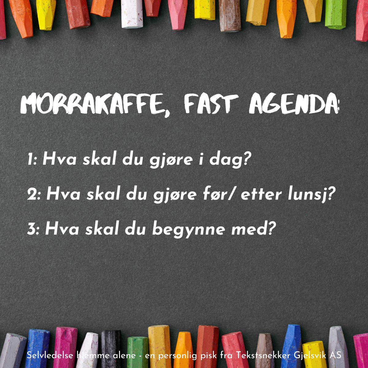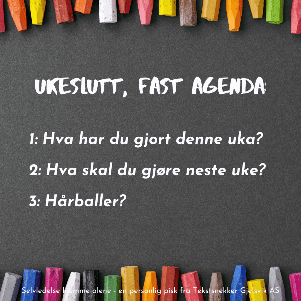 Hver fredag har Tekstsnekker Gjelsvik oppsummerings- og planleggingsmøte (det vil si at jeg har møte med meg, som også er sånn vi gjennomfører vinlotteri, julebord og teambuilding).