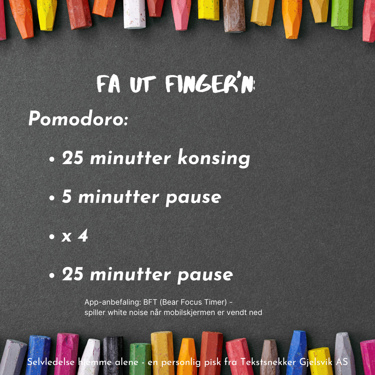 Og så setter jeg på pomodoro-appen på telefonen. Jeg bruker BFT, Bear Focus Timer, som spiller white noise når jeg legger den med skjermen ned. Det er to fluer i en smekk, siden jeg har fryktelig lett for å vippe fram mobilen når jeg prokrastinerer. 25 min konsentrert jobbing, 5 min pause, x 4. Og da er jeg som regel så godt i gang at selv kattevideoer på instagram ikke kan få meg ut av skrivebobla.