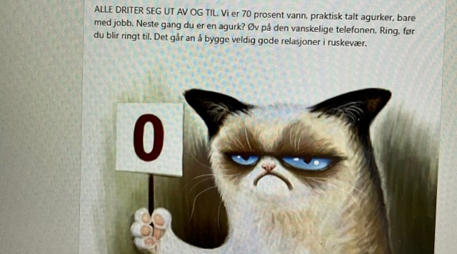 Alle driter seg ut av og til. I livet og arbeidslivet, det er langt, og fullt av muligheter til å gjøre nye feil, og lære nye ting. Vi består av 70 prosent vann, vi er praktisk talt agurker, bare med jobb. Neste gang du er en agurk? Øv deg på den vanskelige telefonen. Ring, før du blir ringt til. Det går an å bygge veldig gode relasjoner i ruskevær.